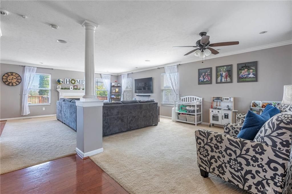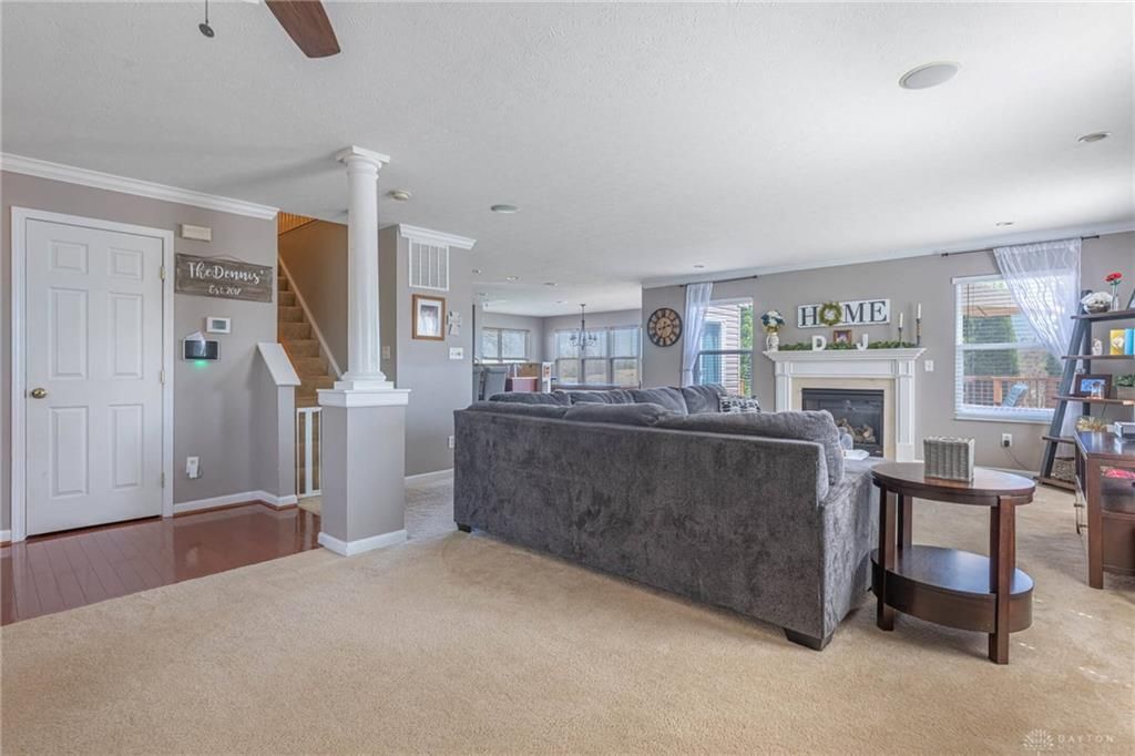 Discover a harmonious blend of comfort and style in this charming Huber Heights residence, offering an inviting curb appeal and serene living. This classic brick and wood siding home, located at 6810 Herron Place, features a pristine lawn and an attached garage. The interior spans 2078 square feet across two stories, with an open layout ideal for relaxation and entertaining. The inviting living room boasts distinct flooring transitions, elegant crown molding, and a cozy fireplace, seamlessly flowing into the kitchen. The spacious kitchen is a culinary haven with rich cabinetry, gleaming granite countertops, a practical kitchen island, and modern stainless steel appliances including a stove, dishwasher, microwave, and refrigerator. A bright dining area offers ample space for meals and beautiful views, with convenient access to outdoor living. This home includes 4 bedrooms, 3 full, 1 half baths, and the versatile, finished basement offers a bonus room perfect for a fifth bedroom or den. Several bedrooms feature plush carpeting, ceiling fans, and crown molding, while the primary bedroom impresses with vaulted ceilings. The primary bathroom offers a double vanity, a spacious soaking tub, and a separate shower. A dedicated laundry space adds functionality. The basement provides ample space for recreation and storage. Outside, a spacious new wooden deck, installed in 2024, is an ideal setting for relaxation and outdoor entertaining, complete with a fire pit area for cozy evenings. Recent updates include a replaced dishwasher in 2020, a new sump pump in 2020, a new AC condenser capacitor in Spring 2022, and a water heater repair with a new expansion tank in 2022. The roof was replaced in 2023, the garbage disposal was replaced in 2023, and the furnace was replaced in 2025. AC/Heat and plumbing have received annual inspections for the past five years.